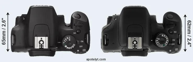 The side-by-side display below illustrates the physical size and weight of the Canon 1000D and the Canon T2i. The two cameras are presented according to their relative size. Three consecutive perspectives from the front, the top, and the back are available. All width, height and depth measures are rounded to the nearest millimeter.