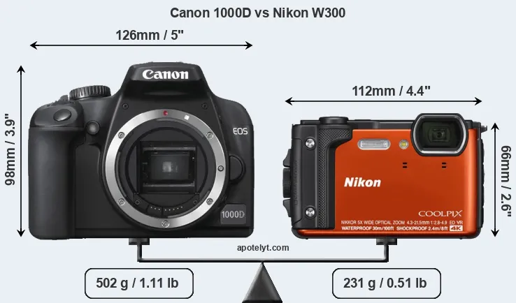 If the front view area (width x height) of the cameras is taken as an aggregate measure of their size, the Nikon W300 is considerably smaller (40 percent) than the Canon 1000D. It is noteworthy in this context that the W300 is splash and dust-proof, while the 1000D does not feature any corresponding weather-sealing. More than that, the W300 is water-proof up to 30m and can, thus, be used for underwater photography.