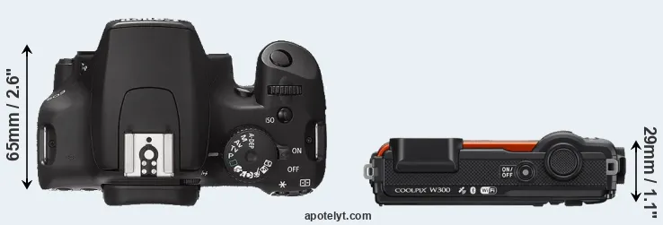 Going beyond this snapshot of core features and characteristics, what are the differences between the Canon EOS 1000D and the Nikon Coolpix W300? Which one should you buy? Read on to find out how these two cameras compare with respect to their body size, their imaging sensors, their shooting features, their input-output connections, and their reception by expert reviewers.