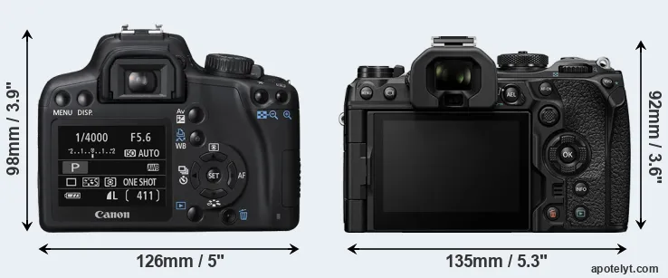The physical size and weight of the Canon 1000D and the OM System OM-1 II are illustrated in the side-by-side display below. The two cameras are presented according to their relative size. Three successive views from the front, the top, and the rear are shown. All width, height and depth dimensions are rounded to the nearest millimeter.