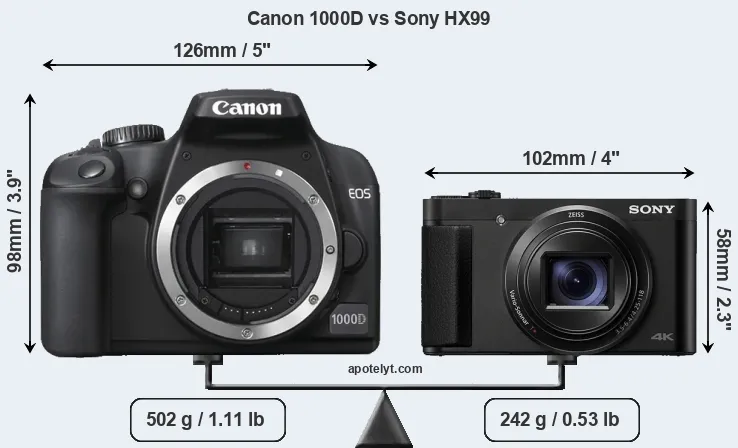 The above size and weight comparisons are to some extent incomplete and possibly misleading, as the HX99 has a lens built in, whereas the 1000D is an interchangeable lens camera that requires a separate lens. Attaching the latter will add extra weight and bulk to the setup. You can compare the optics available for the 1000D and their specifications in the Canon EF Lens Catalog.