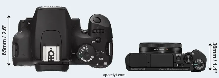 The side-by-side display below illustrates the physical size and weight of the Canon 1000D and the Sony HX99. The two cameras are presented according to their relative size. Three consecutive views from the front, the top, and the rear side are shown. All width, height and depth dimensions are rounded to the nearest millimeter.