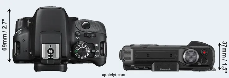 The side-by-side display below illustrates the physical size and weight of the Canon 100D and the Panasonic FT7. The two cameras are presented according to their relative size. Three consecutive perspectives from the front, the top, and the back are available. All size dimensions are rounded to the nearest millimeter.