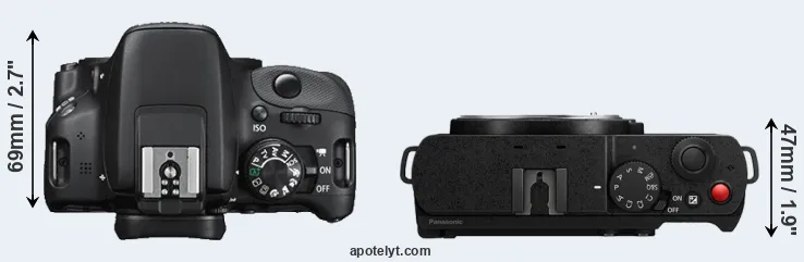 The side-by-side display below illustrates the physical size and weight of the Canon 100D and the Panasonic S9. The two cameras are presented according to their relative size. Three consecutive perspectives from the front, the top, and the back are available. All size dimensions are rounded to the nearest millimeter.
