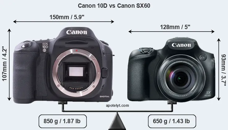 An illustration of the physical size and weight of the Canon 10D and the Canon SX60 is provided in the side-by-side display below. The two cameras are presented according to their relative size. Three consecutive views from the front, the top, and the rear side are shown. All width, height and depth measures are rounded to the nearest millimeter.