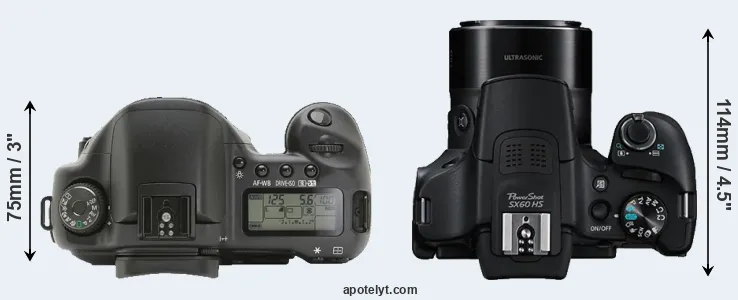 The above size and weight comparisons are to some extent incomplete and possibly misleading, as the SX60 has a lens built in, whereas the 10D is an interchangeable lens camera that requires a separate lens. Attaching the latter will add extra weight and bulk to the setup. You can compare the optics available for the 10D and their specifications in the Canon EF Lens Catalog.