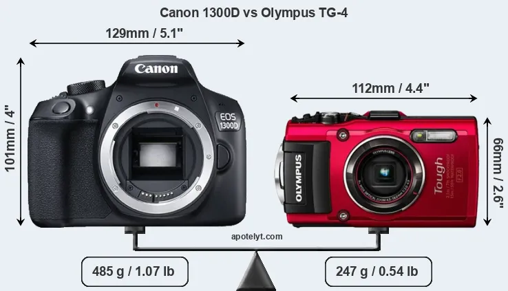 The above size and weight comparisons are to some extent incomplete and possibly misleading, as the TG-4 has a lens built in, whereas the 1300D is an interchangeable lens camera that requires a separate lens. Attaching the latter will add extra weight and bulk to the setup. You can compare the optics available for the 1300D and their specifications in the Canon EF Lens Catalog.