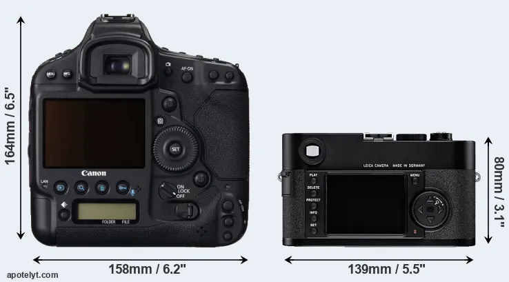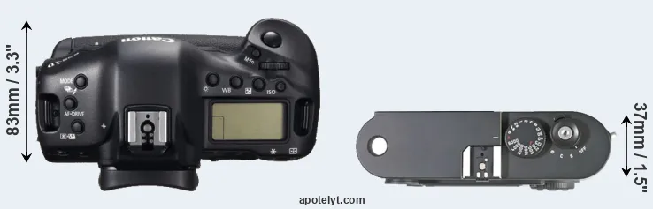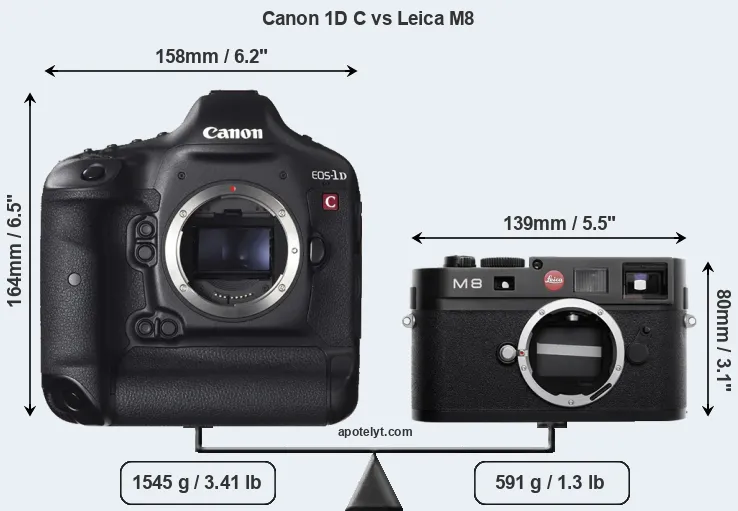 The physical size and weight of the Canon 1D C and the Leica M8 are illustrated in the side-by-side display below. The two cameras are presented according to their relative size. Three consecutive perspectives from the front, the top, and the back are available. All width, height and depth dimensions are rounded to the nearest millimeter.
