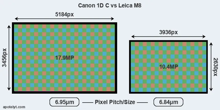 With 17.9MP, the 1DC offers a higher resolution than the M8 (10.4MP), but the 1DC nevertheless has larger individual pixels (pixel pitch of 6.95μm versus 6.84μm for the M8) due to its larger sensor. Moreover, the 1DC is a much more recent model (by 5 years and 6 months) than the M8, and its sensor will have benefitted from technological advances during this time that further enhance the light gathering capacity of its pixels. Coming back to sensor resolution, it should be mentioned that the M8 has no anti-alias filter installed, so that it can capture all the detail its sensor resolves.