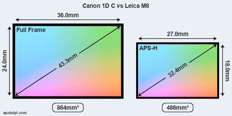 Of the two cameras under consideration, the Canon 1D C features a full frame sensor and the Leica M8 an APS-H sensor. The sensor area in the M8 is 44 percent smaller. As a result of these sensor size differences, the cameras have a format factor of, respectively, 1.0 and 1.3. Both cameras have a native aspect ratio (sensor width to sensor height) of 3:2.