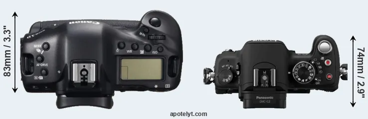 An illustration of the physical size and weight of the Canon 1D C and the Panasonic G2 is provided in the side-by-side display below. The two cameras are presented according to their relative size. Three consecutive views from the front, the top, and the rear side are shown. All size dimensions are rounded to the nearest millimeter.