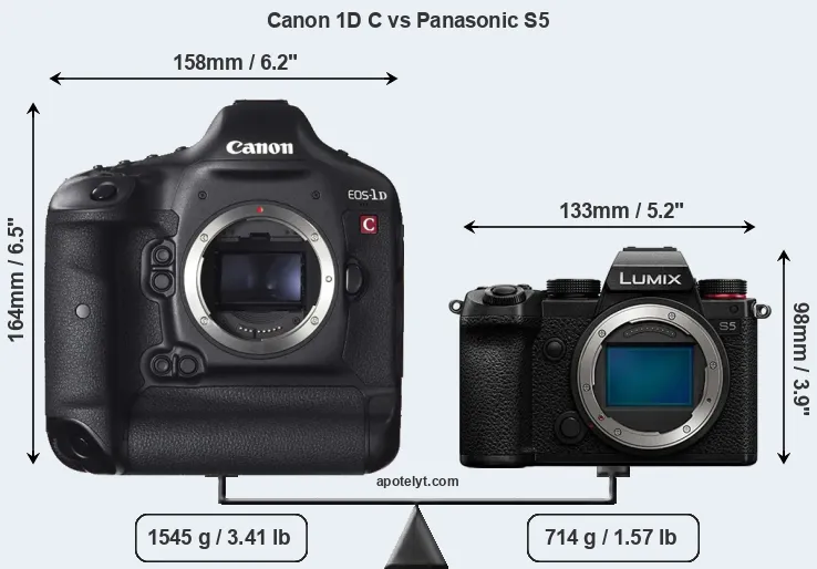 An illustration of the physical size and weight of the Canon 1D C and the Panasonic S5 is provided in the side-by-side display below. The two cameras are presented according to their relative size. Three successive views from the front, the top, and the rear are shown. All width, height and depth measures are rounded to the nearest millimeter.