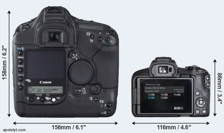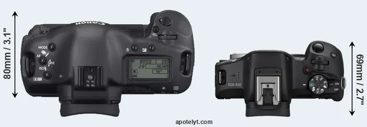 The physical size and weight of the Canon 1D Mark II N and the Canon R50 are illustrated in the side-by-side display below. The two cameras are presented according to their relative size. Three successive views from the front, the top, and the rear are shown. All width, height and depth dimensions are rounded to the nearest millimeter.