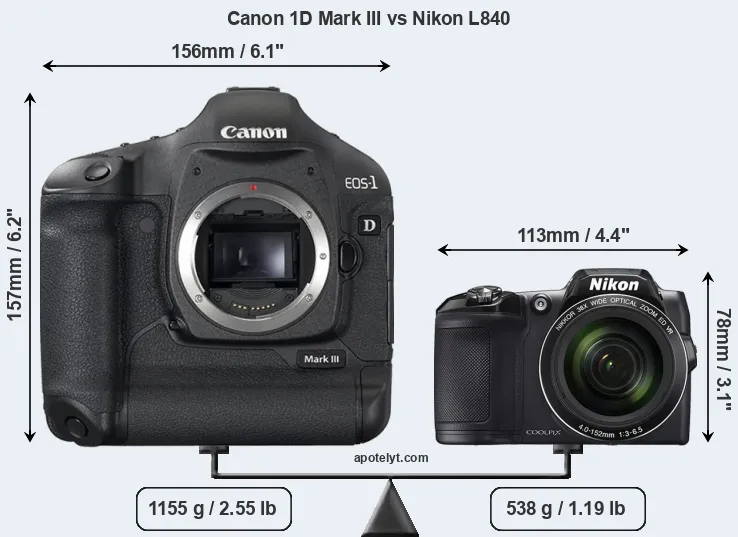 The side-by-side display below illustrates the physical size and weight of the Canon 1D Mark III and the Nikon L840. The two cameras are presented according to their relative size. Three successive views from the front, the top, and the rear are shown. All width, height and depth measures are rounded to the nearest millimeter.