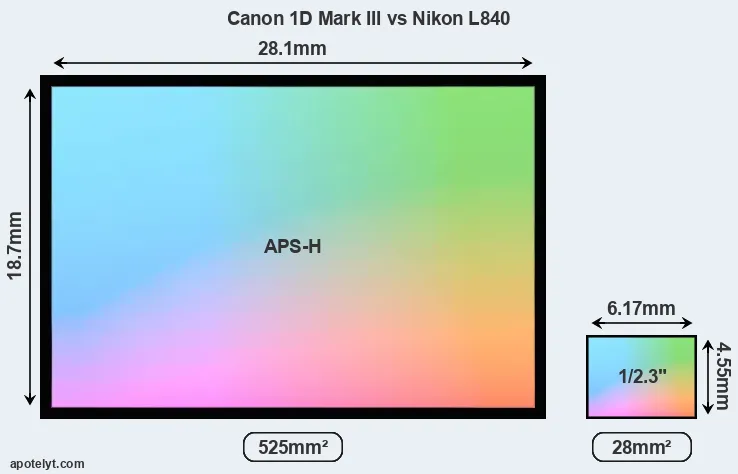 Of the two cameras under consideration, the Canon 1D Mark III features an APS-H sensor and the Nikon L840 a 1/2.3-inch sensor. The sensor area in the L840 is 95 percent smaller. As a result of these sensor size differences, the cameras have a format factor of, respectively, 1.3 and 5.6. The sensor in the 1D Mark III has a native 3:2 aspect ratio, while the one in the L840 offers a 4:3 aspect.