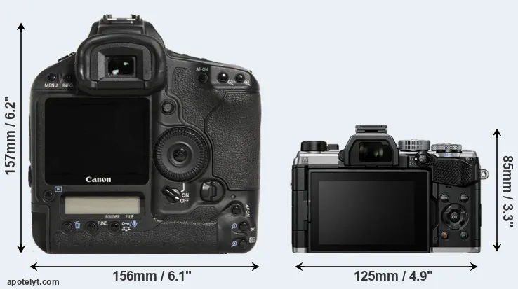 The physical size and weight of the Canon 1D Mark III and the OM System OM-5 are illustrated in the side-by-side display below. The two cameras are presented according to their relative size. Three successive views from the front, the top, and the rear are shown. All width, height and depth measures are rounded to the nearest millimeter.