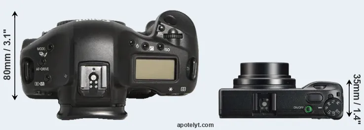 The side-by-side display below illustrates the physical size and weight of the Canon 1D Mark III and the Ricoh GR IIIx. The two cameras are presented according to their relative size. Three consecutive views from the front, the top, and the rear side are shown. All width, height and depth dimensions are rounded to the nearest millimeter.