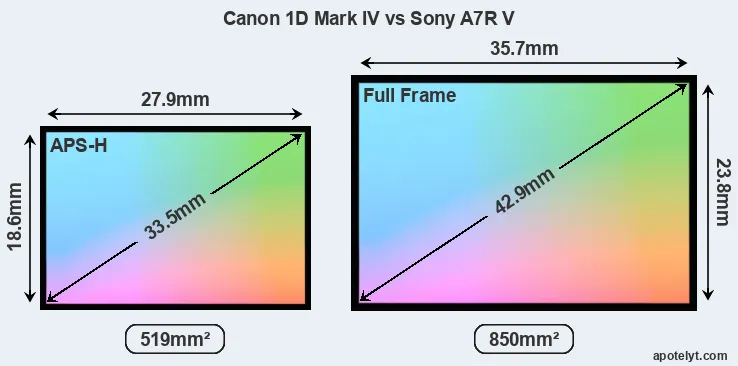 Of the two cameras under consideration, the Canon 1D Mark IV features an APS-H sensor and the Sony A7R V a full frame sensor. The sensor area in the A7R V is 64 percent bigger. As a result of these sensor size differences, the cameras have a format factor of, respectively, 1.3 and 1.0. Both cameras have a native aspect ratio (sensor width to sensor height) of 3:2.