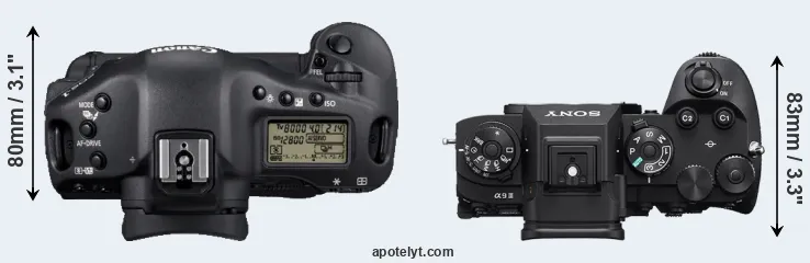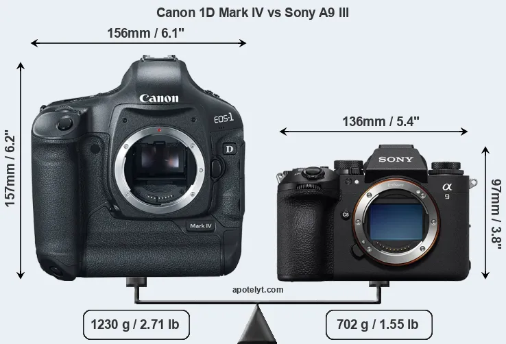 An illustration of the physical size and weight of the Canon 1D Mark IV and the Sony A9 III is provided in the side-by-side display below. The two cameras are presented according to their relative size. Three successive views from the front, the top, and the rear are shown. All width, height and depth dimensions are rounded to the nearest millimeter.