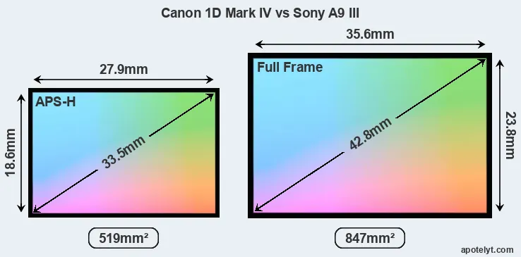 Of the two cameras under consideration, the Canon 1D Mark IV features an APS-H sensor and the Sony A9 III a full frame sensor. The sensor area in the A9 III is 63 percent bigger. As a result of these sensor size differences, the cameras have a format factor of, respectively, 1.3 and 1.0. Both cameras have a native aspect ratio (sensor width to sensor height) of 3:2.
