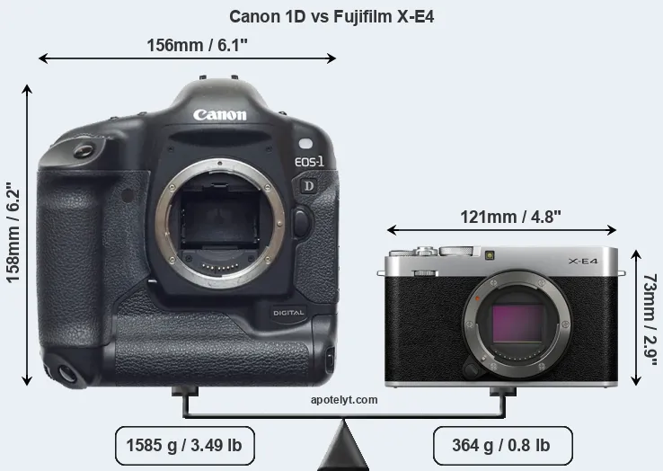 An illustration of the physical size and weight of the Canon 1D and the Fujifilm X-E4 is provided in the side-by-side display below. The two cameras are presented according to their relative size. Three successive views from the front, the top, and the rear are shown. All width, height and depth measures are rounded to the nearest millimeter.