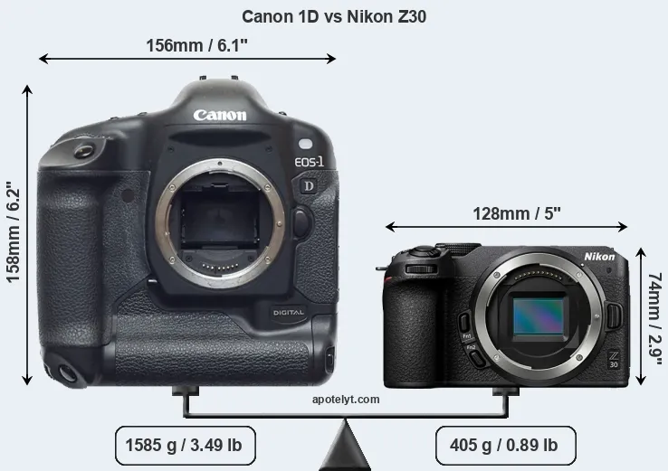 The physical size and weight of the Canon 1D and the Nikon Z30 are illustrated in the side-by-side display below. The two cameras are presented according to their relative size. Three successive views from the front, the top, and the rear are shown. All width, height and depth measures are rounded to the nearest millimeter.