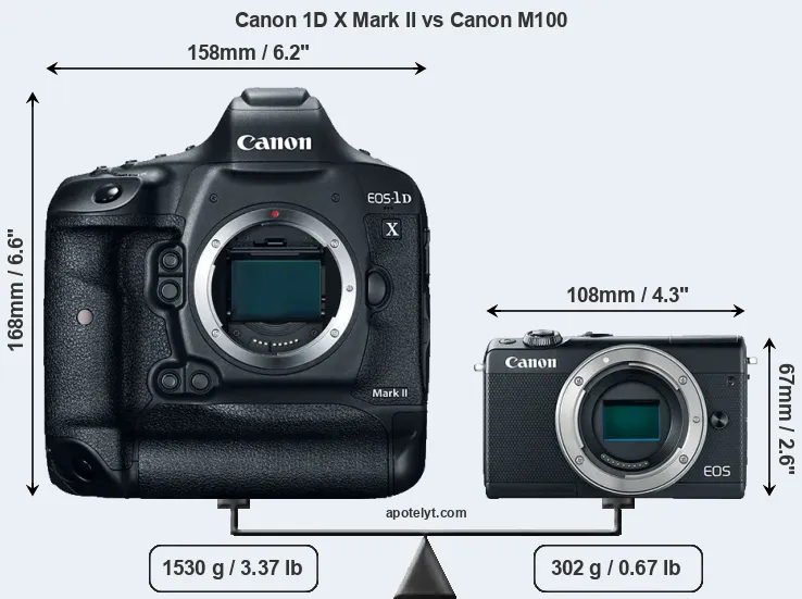An illustration of the physical size and weight of the Canon 1D X Mark II and the Canon M100 is provided in the side-by-side display below. The two cameras are presented according to their relative size. Three successive views from the front, the top, and the rear are shown. All width, height and depth dimensions are rounded to the nearest millimeter.