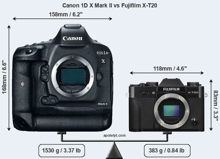 If the front view area (width x height) of the cameras is taken as an aggregate measure of their size, the Fujifilm X-T20 is considerably smaller (63 percent) than the Canon 1D X Mark II. Moreover, the X-T20 is substantially lighter (75 percent) than the 1DX Mark II. It is worth mentioning in this context that the 1DX Mark II is splash and dust resistant, while the X-T20 does not feature any corresponding weather-sealing.