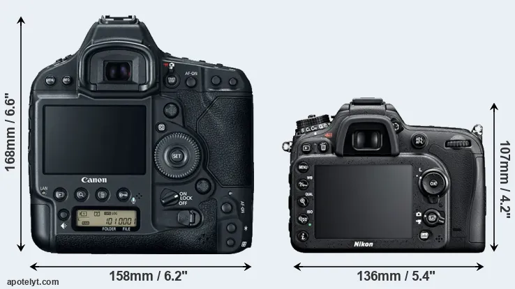 The side-by-side display below illustrates the physical size and weight of the Canon 1D X Mark II and the Nikon D7100. The two cameras are presented according to their relative size. Three consecutive perspectives from the front, the top, and the back are available. All width, height and depth measures are rounded to the nearest millimeter.