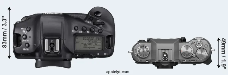 The physical size and weight of the Canon 1D X Mark III and the Fujifilm X-T50 are illustrated in the side-by-side display below. The two cameras are presented according to their relative size. Three consecutive views from the front, the top, and the rear side are shown. All width, height and depth measures are rounded to the nearest millimeter.