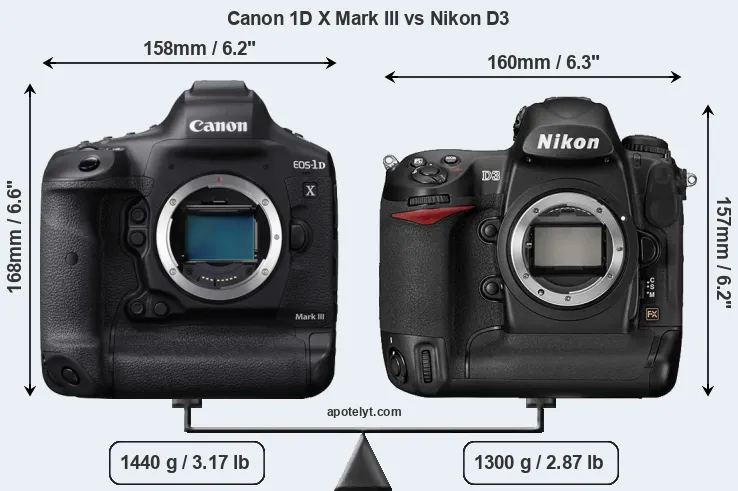An illustration of the physical size and weight of the Canon 1D X Mark III and the Nikon D3 is provided in the side-by-side display below. The two cameras are presented according to their relative size. Three successive views from the front, the top, and the rear are shown. All width, height and depth dimensions are rounded to the nearest millimeter.
