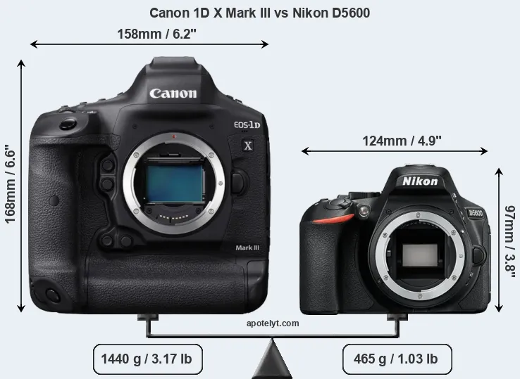The physical size and weight of the Canon 1D X Mark III and the Nikon D5600 are illustrated in the side-by-side display below. The two cameras are presented according to their relative size. Three successive views from the front, the top, and the rear are shown. All width, height and depth measures are rounded to the nearest millimeter.