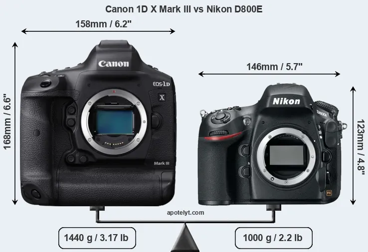 An illustration of the physical size and weight of the Canon 1D X Mark III and the Nikon D800E is provided in the side-by-side display below. The two cameras are presented according to their relative size. Three consecutive views from the front, the top, and the rear side are shown. All width, height and depth measures are rounded to the nearest millimeter.