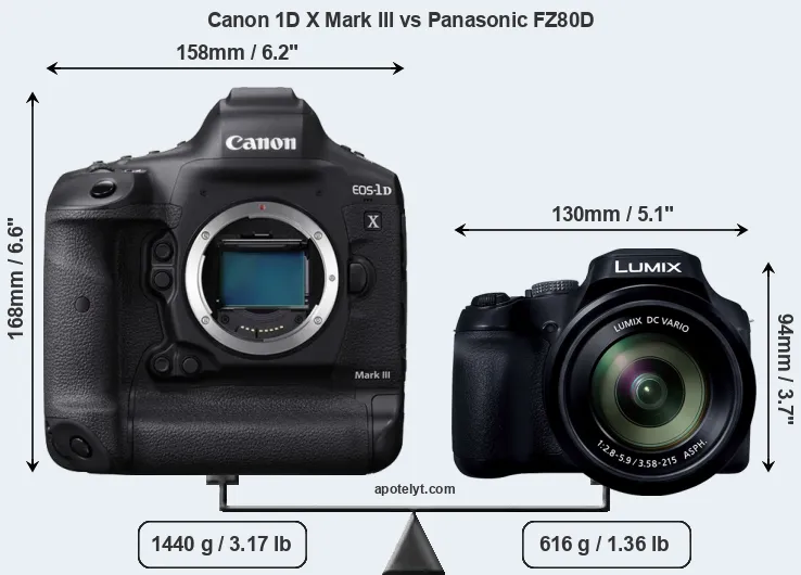 The side-by-side display below illustrates the physical size and weight of the Canon 1D X Mark III and the Panasonic FZ80D. The two cameras are presented according to their relative size. Three consecutive views from the front, the top, and the rear side are shown. All width, height and depth measures are rounded to the nearest millimeter.