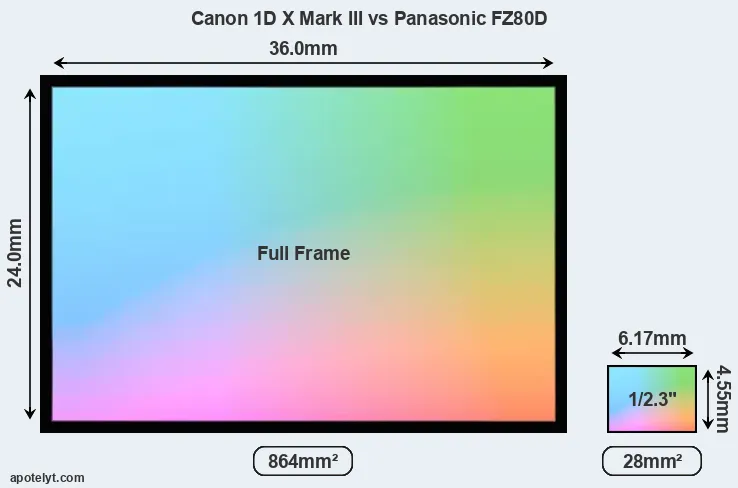 Of the two cameras under consideration, the Canon 1D X Mark III features a full frame sensor and the Panasonic FZ80D a 1/2.3-inch sensor. The sensor area in the FZ80D is 97 percent smaller. As a result of these sensor size differences, the cameras have a format factor of, respectively, 1.0 and 5.6. The sensor in the 1DX Mark III has a native 3:2 aspect ratio, while the one in the FZ80D offers a 4:3 aspect.