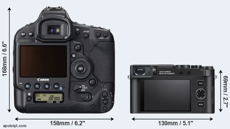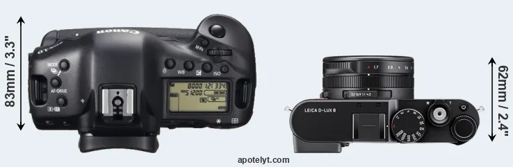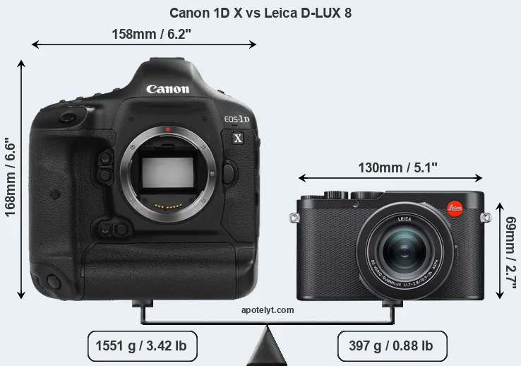 The physical size and weight of the Canon 1D X and the Leica D-LUX 8 are illustrated in the side-by-side display below. The two cameras are presented according to their relative size. Three consecutive views from the front, the top, and the rear side are shown. All size dimensions are rounded to the nearest millimeter.