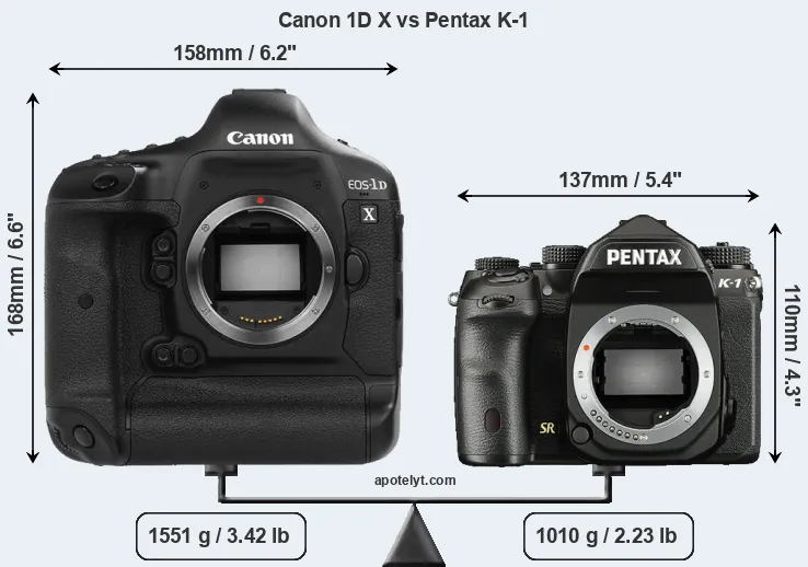The physical size and weight of the Canon 1D X and the Pentax K-1 are illustrated in the side-by-side display below. The two cameras are presented according to their relative size. Three consecutive views from the front, the top, and the rear side are shown. All width, height and depth dimensions are rounded to the nearest millimeter.