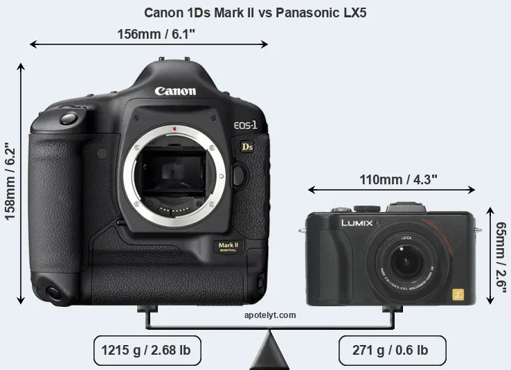 The physical size and weight of the Canon 1Ds Mark II and the Panasonic LX5 are illustrated in the side-by-side display below. The two cameras are presented according to their relative size. Three consecutive perspectives from the front, the top, and the back are available. All width, height and depth measures are rounded to the nearest millimeter.