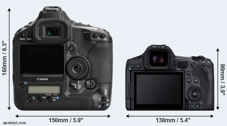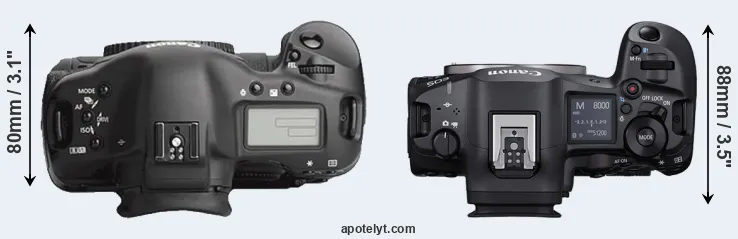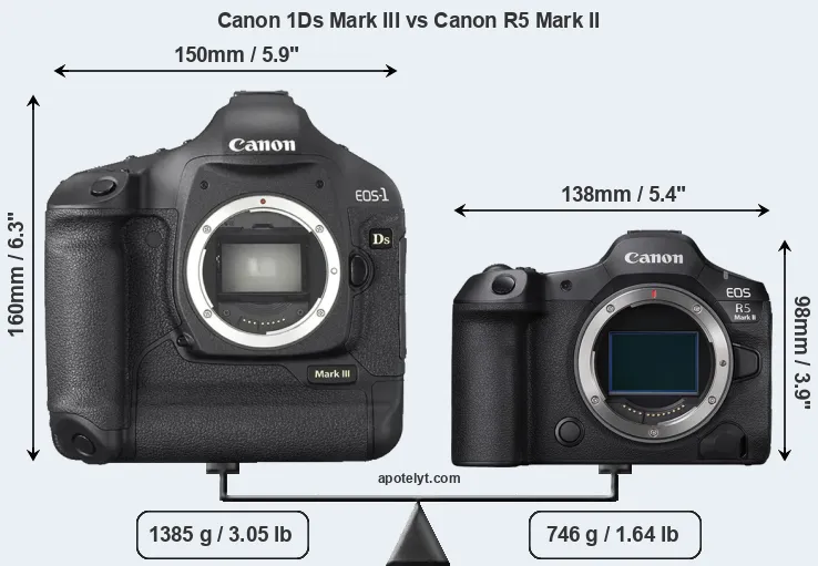 The side-by-side display below illustrates the physical size and weight of the Canon 1Ds Mark III and the Canon R5 Mark II. The two cameras are presented according to their relative size. Three successive views from the front, the top, and the rear are shown. All size dimensions are rounded to the nearest millimeter.
