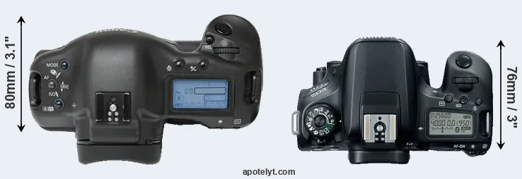 The physical size and weight of the Canon 1Ds and the Canon 77D are illustrated in the side-by-side display below. The two cameras are presented according to their relative size. Three successive views from the front, the top, and the rear are shown. All width, height and depth dimensions are rounded to the nearest millimeter.