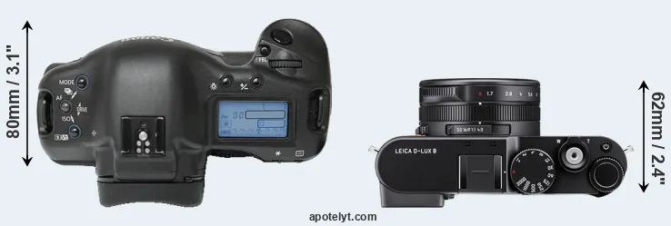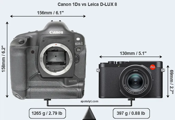 The above size and weight comparisons are to some extent incomplete and possibly misleading, as the D-LUX 8 has a lens built in, whereas the 1Ds is an interchangeable lens camera that requires a separate lens. Attaching the latter will add extra weight and bulk to the setup. You can compare the optics available for the 1Ds and their specifications in the Canon EF Lens Catalog.