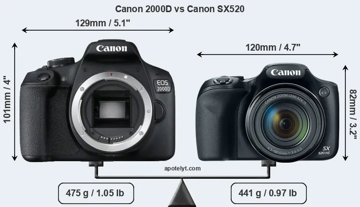 The physical size and weight of the Canon 2000D and the Canon SX520 are illustrated in the side-by-side display below. The two cameras are presented according to their relative size. Three consecutive perspectives from the front, the top, and the back are available. All width, height and depth dimensions are rounded to the nearest millimeter.