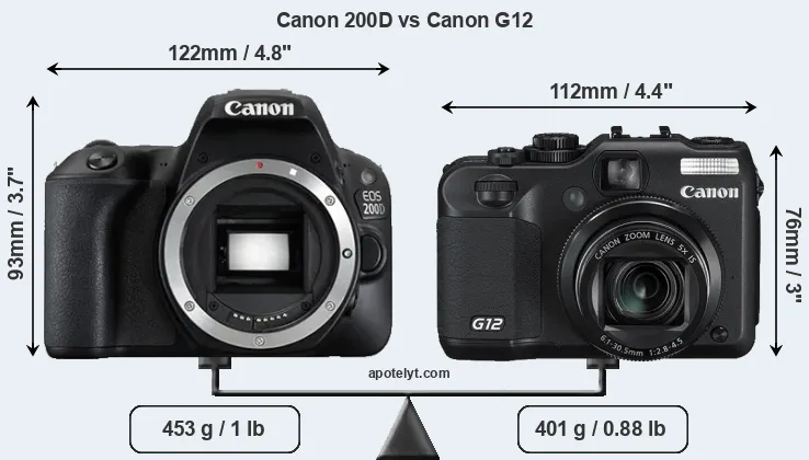 An illustration of the physical size and weight of the Canon 200D and the Canon G12 is provided in the side-by-side display below. The two cameras are presented according to their relative size. Three consecutive perspectives from the front, the top, and the back are available. All size dimensions are rounded to the nearest millimeter.
