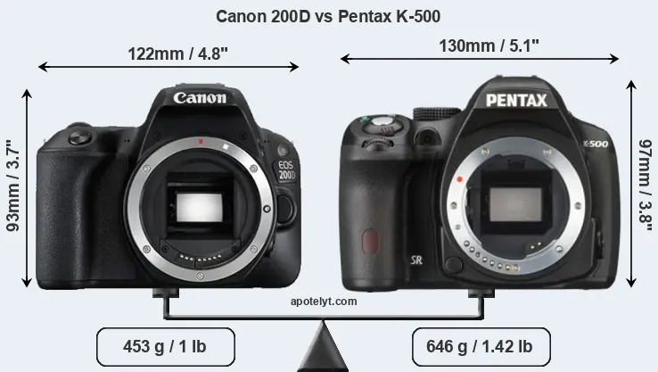 If the front view area (width x height) of the cameras is taken as an aggregate measure of their size, the Pentax K-500 is notably larger (11 percent) than the Canon 200D. Moreover, the K-500 is substantially heavier (43 percent) than the 200D. In this context, it is worth noting that neither the 200D nor the K-500 are weather-sealed.