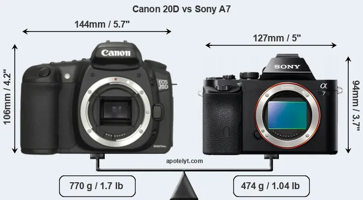 If the front view area (width x height) of the cameras is taken as an aggregate measure of their size, the Sony A7 is notably smaller (22 percent) than the Canon 20D. Moreover, the A7 is substantially lighter (38 percent) than the 20D. It is noteworthy in this context that the A7 is splash and dust-proof, while the 20D does not feature any corresponding weather-sealing.