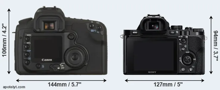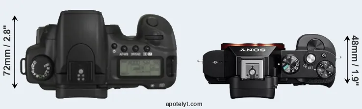 The physical size and weight of the Canon 20D and the Sony A7 are illustrated in the side-by-side display below. The two cameras are presented according to their relative size. Three consecutive perspectives from the front, the top, and the back are available. All width, height and depth dimensions are rounded to the nearest millimeter.