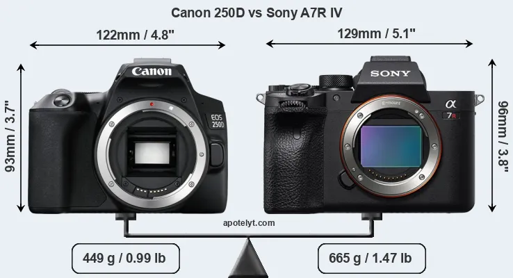The physical size and weight of the Canon 250D and the Sony A7R IV are illustrated in the side-by-side display below. The two cameras are presented according to their relative size. Three consecutive perspectives from the front, the top, and the back are available. All size dimensions are rounded to the nearest millimeter.