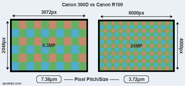 Despite having a slightly smaller sensor, the R100 offers a higher resolution of 24 megapixels, compared with 6.3 MP of the 300D. This megapixels advantage comes at the cost of a higher pixel density and a smaller size of the individual pixel (with a pixel pitch of 3.72μm versus 7.38μm for the 300D). However, it should be noted that the R100 is much more recent (by 19 years and 9 months) than the 300D, and its sensor will have benefitted from technological advances during this time that make it possible to gather light more efficiently. Coming back to sensor resolution, it should be mentioned that the R100 has no anti-alias filter installed, so that it can capture all the detail its sensor resolves.