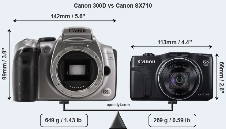 An illustration of the physical size and weight of the Canon 300D and the Canon SX710 is provided in the side-by-side display below. The two cameras are presented according to their relative size. Three successive views from the front, the top, and the rear are shown. All width, height and depth dimensions are rounded to the nearest millimeter.
