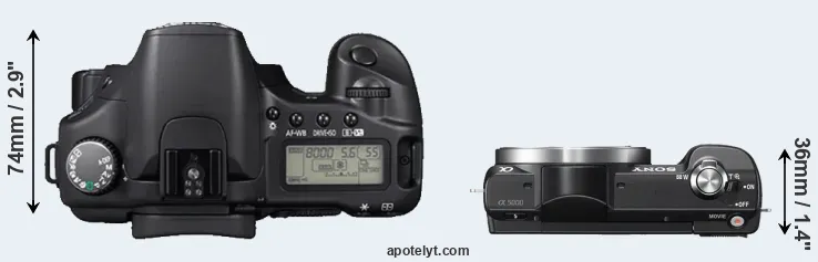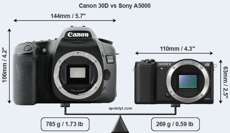 An illustration of the physical size and weight of the Canon 30D and the Sony A5000 is provided in the side-by-side display below. The two cameras are presented according to their relative size. Three consecutive views from the front, the top, and the rear side are shown. All width, height and depth measures are rounded to the nearest millimeter.